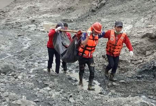 7月2日,救援人员在缅甸克钦邦帕甘地区转移遇难者遗体(手机拍摄)。新华社 图