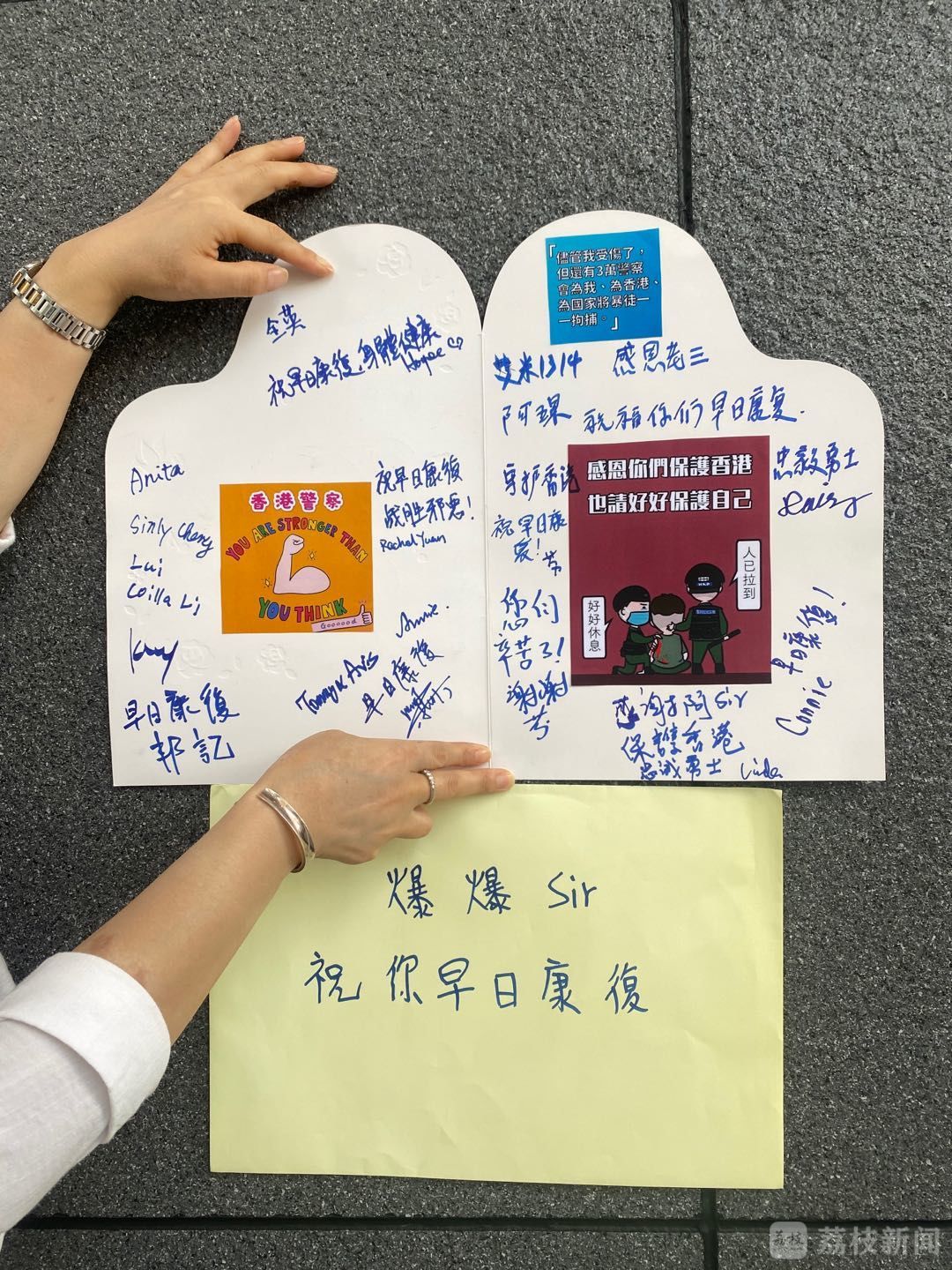 记者看到许多市民制作的心意卡上写满“祝早日康复”、“忠义勇士”“感谢阿Sir保护香港”等祝福语与感谢语,还有许多手绘的警察形象。