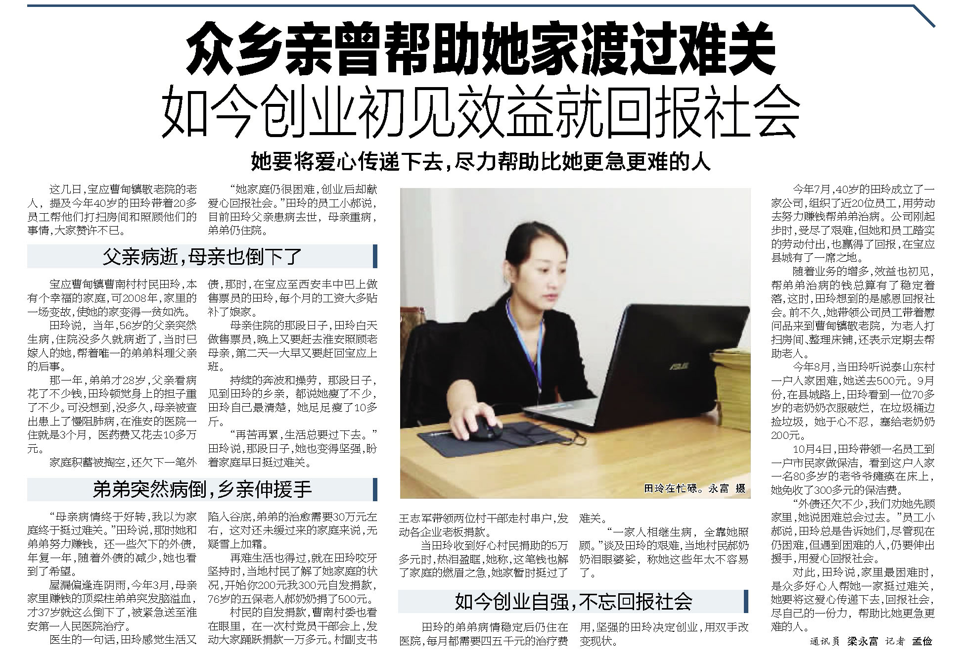 2017年10月10日,本报刊发报道《众乡亲曾帮助她家渡过难关,如今创业初见效益就回报社会》,在田玲家里最困难时,众多好心人帮她一家挺过难关,她创业后回报社会,尽自己的一份力,帮助比她更急更难的人,将爱心传递下去。