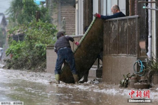 日本熊本县发生罕见暴雨天气,造成河川泛滥和地质灾害。图为清理受灾现场。