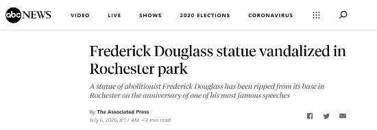 因为“黑人之死”引发的反种族歧视行为席卷全美,多座美国内战时期南方邦联将领及多位美国前总统的雕像都被示威者推倒。但报道提到,道格拉斯是19世纪废奴运动领袖。值得注意的是,1852年7月5日,道格拉斯还曾发表著名演讲,批评说“在一个奴役、压迫黑人的国家中,7月4日庆祝自由的活动是虚伪的”。