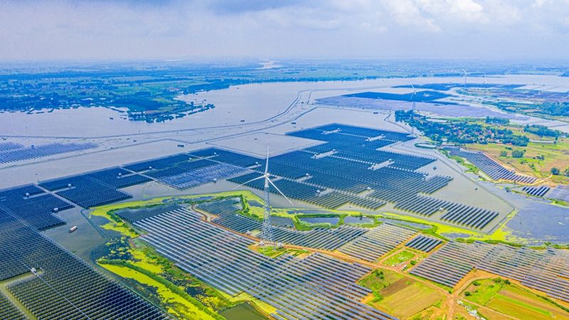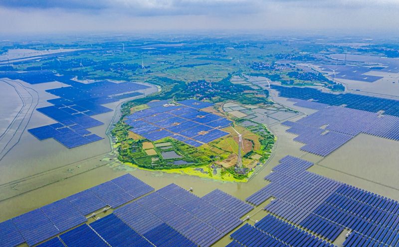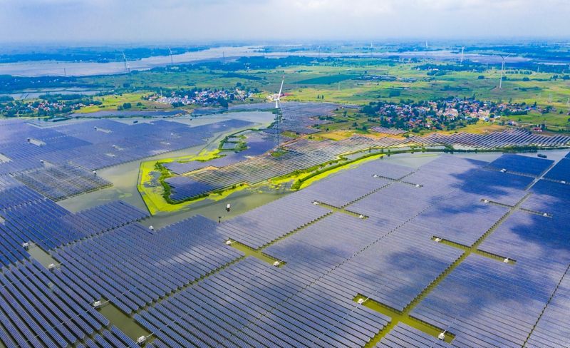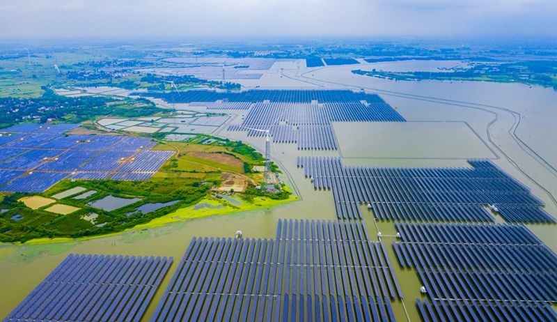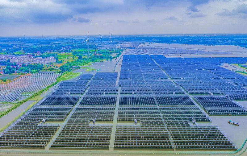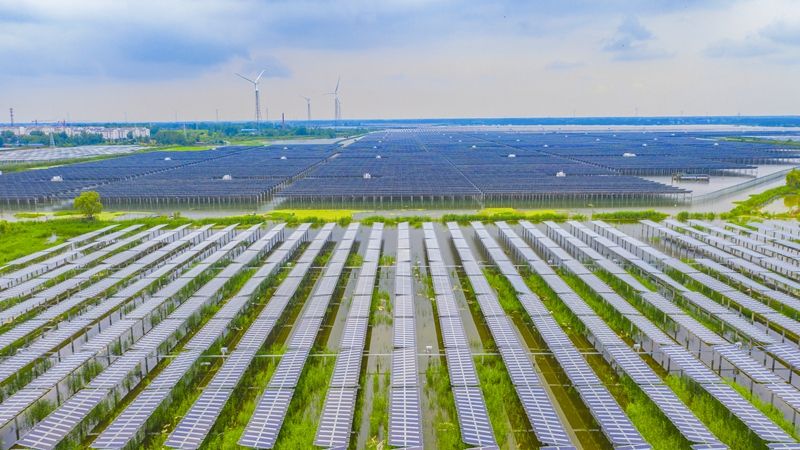 6月30日,泗洪光伏发电领跑基地奖励激励项目成功并网发电,至此,泗洪县拥有两个500MW光伏发电领跑项目,年发电总量达到13亿千瓦时,年可节约标准煤52万吨,减少二氧化碳排放128万吨。作为全国唯一覆盖“渔光”、“牧光”、“农光”三种生态模式的地区,在成片光伏电板下,不仅可以渔业养殖,还可以养猪、种植油牡丹,同时发展乡村旅游。2019年全县 “板下经济”实现收入9000万元、旅游收入4000万元。(摄影:张笑)
