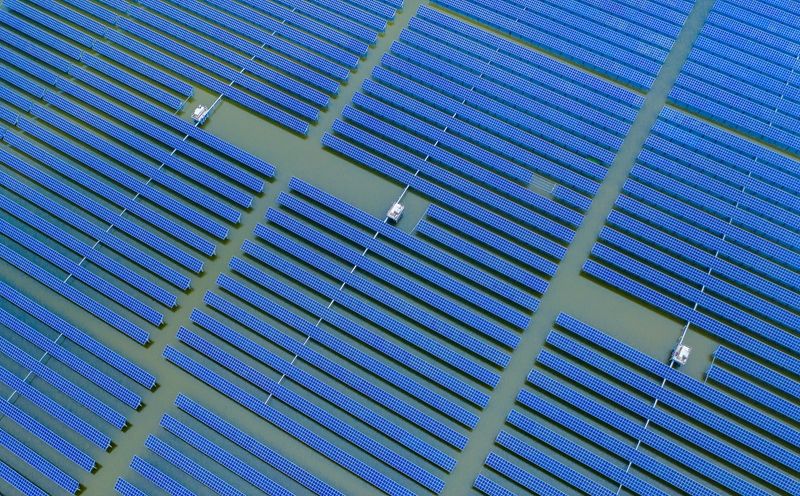 7月4日,泗洪县天岗湖乡光伏发电领跑基地,一望无际的光伏电板蔚为壮观,充满韵律。