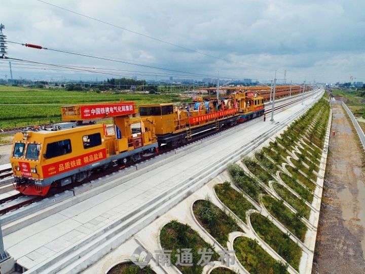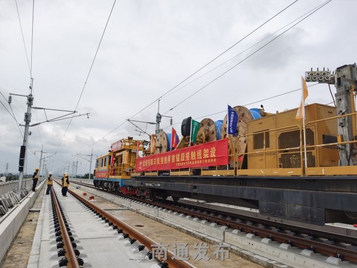 随着沪苏通铁路投入运营,盐通高铁也在抓紧施工之中。4日中午11时,中国铁建电气化局盐通项目泰斯美克恒张力放线车以5km/h的速度缓缓开行,将长度为1365米的第一条接触线,成功架设在盐通铁路大丰至东台站间52锚段,标志着盐通铁路接触网工程进入全面攻坚阶段。