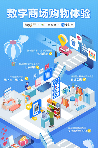 华润置地旗下购物中心及自有顾客服务平台“一点万象”与支付宝共同宣布,将在零售数字化升级方面展开合作, “一点万象”平台正式上线支付宝小程序,为消费者提供从商场泊车,到离店售后的全流程线上线下融合购物体验。