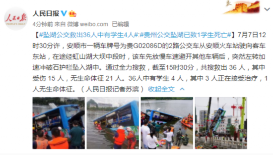 【#坠湖公交救出36人中有学生4人#:#贵州公交坠湖已致1学生死亡#】7月7日12时30分许,安顺市一辆车牌号为贵G02086D的2路公交车从安顺火车站驶向客车东站,在途经虹山湖大坝中段时,该车先放慢车速避开其他车辆后,突然左转加速冲破石护栏坠入湖中。通过全力搜救,截至15时30分,共搜救出 36 人,其中受伤 15 人,无生命体征 21 人。36人中有学生 4 人,其中 3 人正在接受治疗,1人无生命体征。(人民日报记者苏滨)