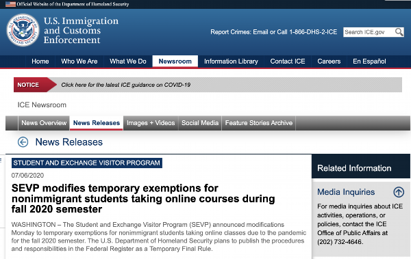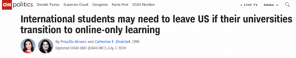 美国移民和海关执法局称,若一些院校在秋季学期全部转向在线教学,“美国国务院将不会向这些院校的学生发放签证,美国海关和边境保护局也不会允许这些学生进入美国”。