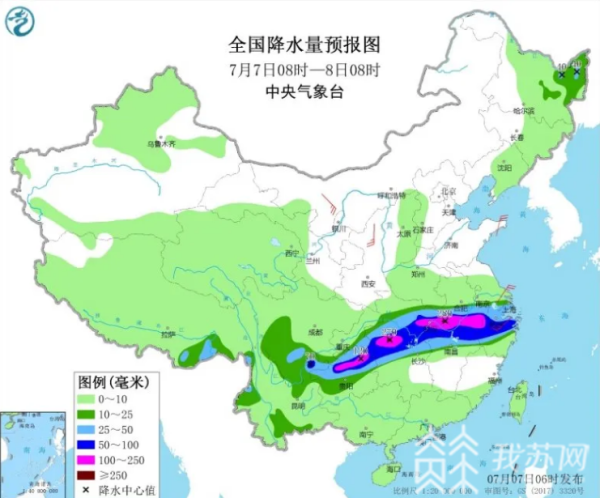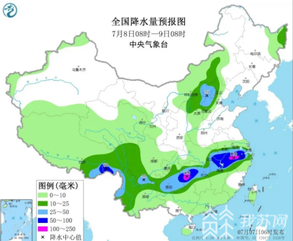 具体来看,7月7日08时至8日08时,黑龙江东部、江淮西部、江汉南部、江南北部、西南地区中部和南部、西藏东部等地部分地区有中到大雨,其中,浙江中部、安徽南部、江西北部、湖北东部和南部、湖南北部、重庆东南部、贵州北部、云南北部等地部分地区有暴雨或大暴雨,湖北东部、湖南北部等地局地特大暴雨(250~280毫米)。