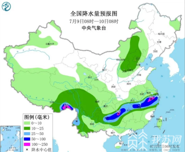 7月9日08时至10日08时,华北中北部、江南北部、广西北部、贵州南部、云南西部和北部、四川西部和南部、西藏东部等地部分地区有中到大雨,其中,浙江中北部、安徽南部、江西北部、湖南西部、贵州东南部、西藏东南部等地部分地区有暴雨或大暴雨(100~170毫米)。