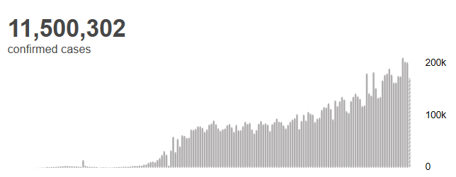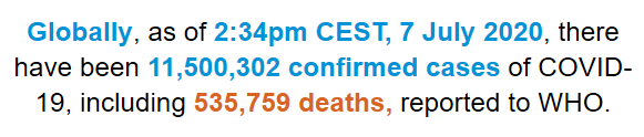 根据世卫组织最新实时统计数据,截至欧洲中部夏令时间7月7日14时34分(北京时间7月7日20时34分),全球累计新冠肺炎确诊病例11500302例,累计死亡病例535759例。