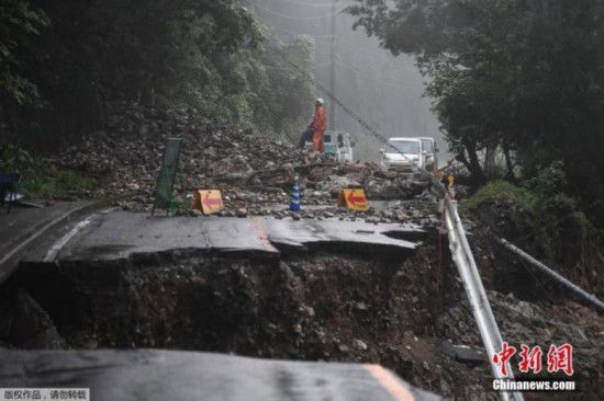 7月8日消息,受停滞的梅雨锋面影响,日本九州地区北部7日继续遭遇强降雨天气。图为日本熊本县一处公路坍塌。