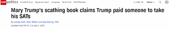 在新书《太多和永远不够:我的家族如何造就了世界上最危险的人》中,玛丽写道,特朗普招募了“一个聪明的孩子,一个有名气的优秀应试者来替他考SAT”。她还补充说,这名替特朗普考试的人为此付出了很多努力。