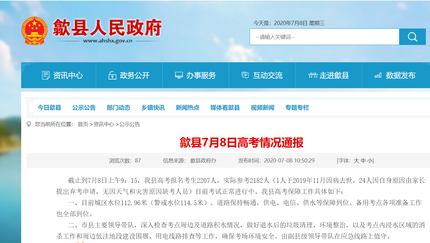 荔枝新闻讯 据安徽省歙县人民政府网站消息,截止到7月8日上午9:15,歙县高考报名考生2207人,实际参考2182人(1人于2019年11月因病去世,24人因自身原因由家长提出弃考申请,无因天气和灾害原因缺考人员)目前考试正常进行中。歙县高考保障工作具体如下: