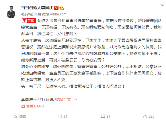 我作为股东会和董事会选举的董事长,依据股东会决议,带领管理团队接管当当,于理有据,于法有依。现在我被强制传唤,无论面临何种处罚,我坦然承当,求仁得仁,又何患哉?