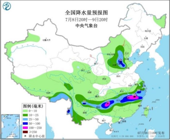 据预计,7月8日20时至9日20时,江西中北部、福建北部、浙江中南部、上海、湖南中部、贵州中南部、广西北部、云南西部和东北部、四川南部以及华北中西部等地有大到暴雨。