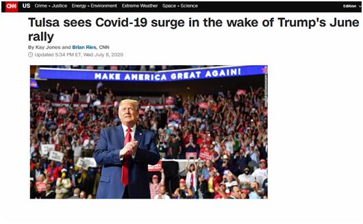 值得一提的是,6月20日,特朗普举行了美国发生新冠疫情以来的首场竞选集会,地点就选在当时疫情相对较轻的塔尔萨的一处室内场馆。这是新冠疫情期间,全球规模最大的室内集会之一。卫生专家建议避免举办大型人群聚集活动,但特朗普和他的顾问们坚持,认为重回集会演讲台有助特朗普重振士气、提升民意支持率并向共和党人展示竞选状态。CNN说,塔尔萨消防局称,大约有6200人参加了此次集会。