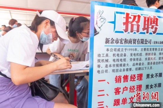 资料图:7月4日,山西太原,求职者在会场寻觅工作岗位。当日,太原人才大市场举行今年首场线下毕业生专场招聘会,众多高校毕业生前来求职应聘。 中新社记者 武俊杰 摄