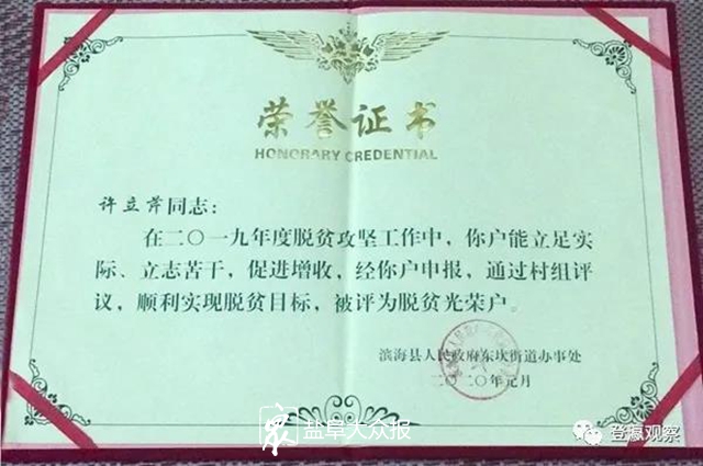 经过村和街道评议、核实,去年9月份,东坎街道批准许立芹家脱贫,并向其颁发了“脱贫光荣户”荣誉证书。“别人帮得了我一时,帮不了我一世。今后,我要靠自己养活我的两个孩子。”许立芹说。