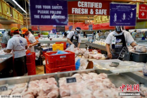 当地时间2020年7月8日,菲律宾奎松市,为防止新冠病毒传播,当地商铺实施防疫举措强制要求顾客戴口罩。