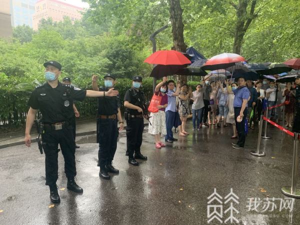 高考首日下午,南京突然下起了瓢泼大雨,虽然给闷热的天气带来一丝凉爽,但这场突如其来的大雨着实让没有准备雨具的考生和家长们犯了难。在金陵中学考点门口,鼓楼公安分局执勤民警和考生家长们列队举伞,为考生们搭起一座“伞桥”。同时,民警们还将遮阳棚也一并搬来,护送学生们走出考场。考场的考生们在民警和家长们的爱心遮雨接龙下,顺利离开。