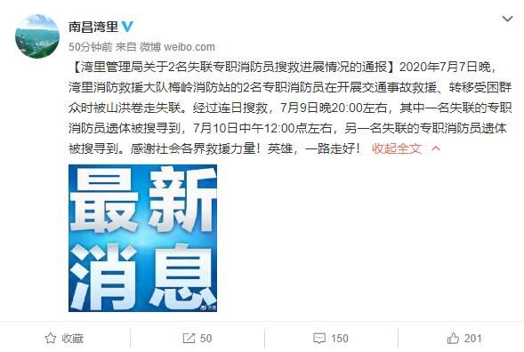 通报如下: 2020年7月7日晚,湾里消防救援大队梅岭消防站的2名专职消防员在开展交通事故救援、转移受困群众时被山洪卷走失联。