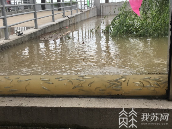 7月10日中午12点,长江南京潮水位站当前水位9.60米,超警戒水位0.90米。位于南京下关的民国首都电厂旧址公园意外变成了一座“水族箱”。由于长江水位漫过了公园内的玻璃围栏,不少小鱼群游到了玻璃边,有小毛鱼、鲫鱼等,时不时也能看到大鱼从这里经过。