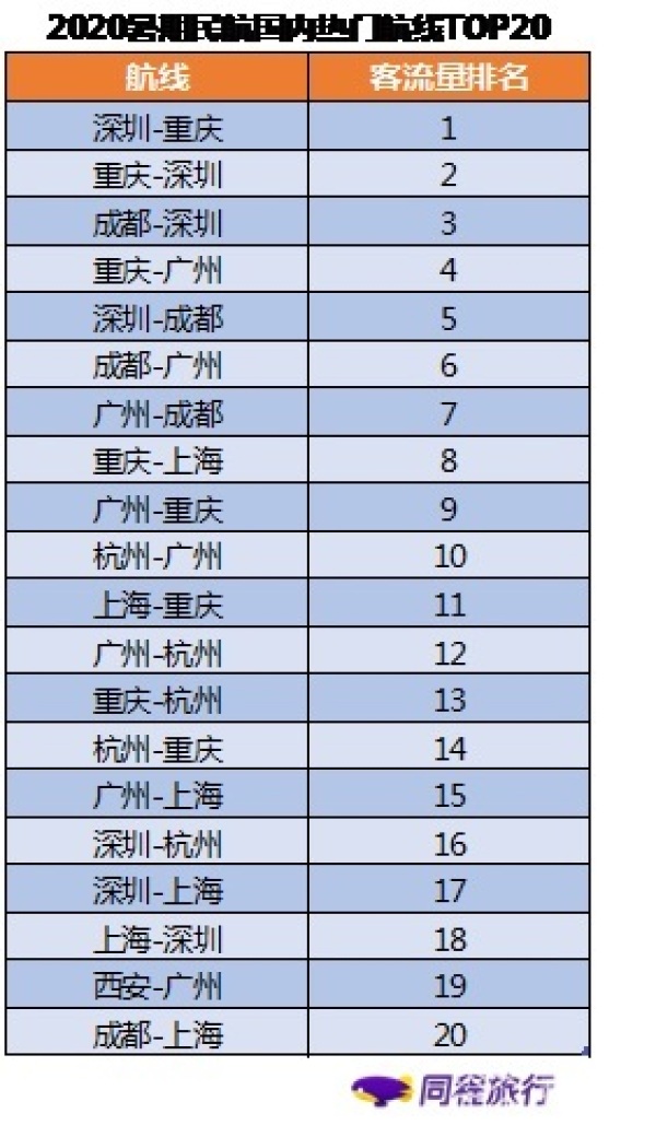 来自某旅行平台的机票大数据显示,暑运期间,深圳——重庆、重庆——深圳、成都——深圳、重庆——广州、深圳——成都、成都——广州、重庆——上海等20条线路的客流量相对较大,整体上客流量较大的机场主要集中在深圳、广州、上海、重庆、成都、杭州、西安等一线城市及区域中心城市。