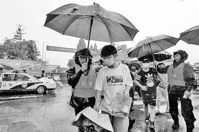 7月7日,安徽省黄山市歙县遭遇50年一遇的洪涝灾害,县城多处严重积水、道路受阻,大量考生无法赶到考场,歙县考区将原定7月7日进行的语文、数学科目考试延期至7月9日举行。图为7月8日歙县二中考点,武警官兵雨中护送考生。施亚磊摄/光明图片