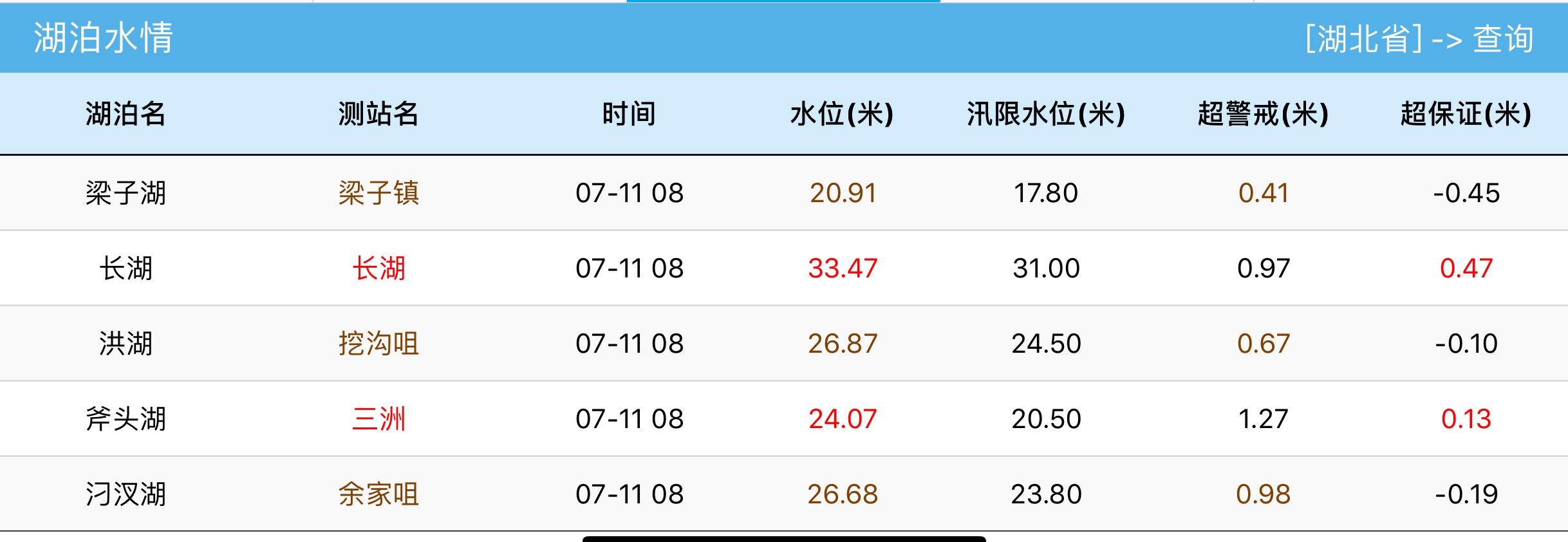 受强降雨影响,湖北长湖水位持续上涨,截至7月11日08点,长湖水位达到33.47米,超保证水位0.47米,比2016年的历史最高水位33.46米高出0.01米,防汛形势严峻。荆州市防汛部门已对沙市区、纪南文旅区下达马子湖、胜利垸分洪预通知。按照预案,待省下达分洪令后,立即执行。