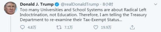当地时间7月10日,美国总统特朗普发推称:“太多的大学和学校系统(在向学生)进行激进左翼思想灌输,而不是(从事)教育。”