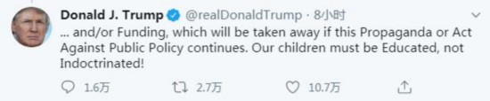 他继续说道:“因此,我要告诉财政部重新审查他们的免税资格及受资助情况,如果这种宣传或违反公共政策的行为继续下去,这些(资格及资助)都将被取消。我们的孩子必须接受教育,而不是接受(激进左翼)思想灌输!”