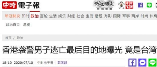 10日下午,台湾“中时电子报”以“香港袭警男子逃亡最后目的地曝光 竟是台湾”为题对此事进行报道。↓