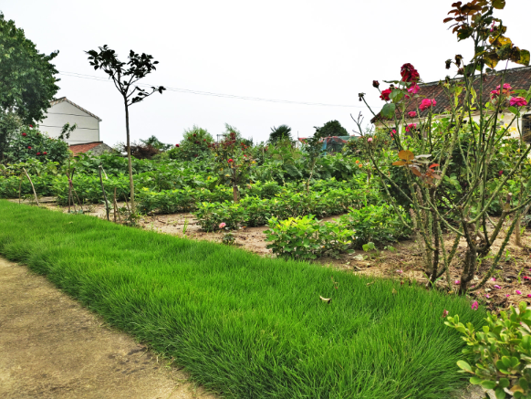来到仲辉村范素琴的家,好似走进了一个微型街心花园。正值盛夏,宅后一丛丛的大丽花开得正艳。自留地里,一垅花生,一排果树交替伸展,田垅收尾处,紫色的鸢尾、黄色的猫脸花镶边,屋后的遮阳棚下还有很多叫不上名的花花草草……屋外是公园,屋内也悦目,对门的堂屋被收拾成客厅,花草也成了最重要的装饰品。她家的厨房收拾的也是特别的整洁,杂而不乱,透露着这家主人的勤劳品性。