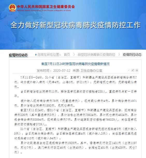 7月11日0—24时,31个省(自治区、直辖市)和新疆生产建设兵团报告新增确诊病例7例,均为境外输入病例(天津4例,上海2例,浙江1例);无新增死亡病例;无新增疑似病例。