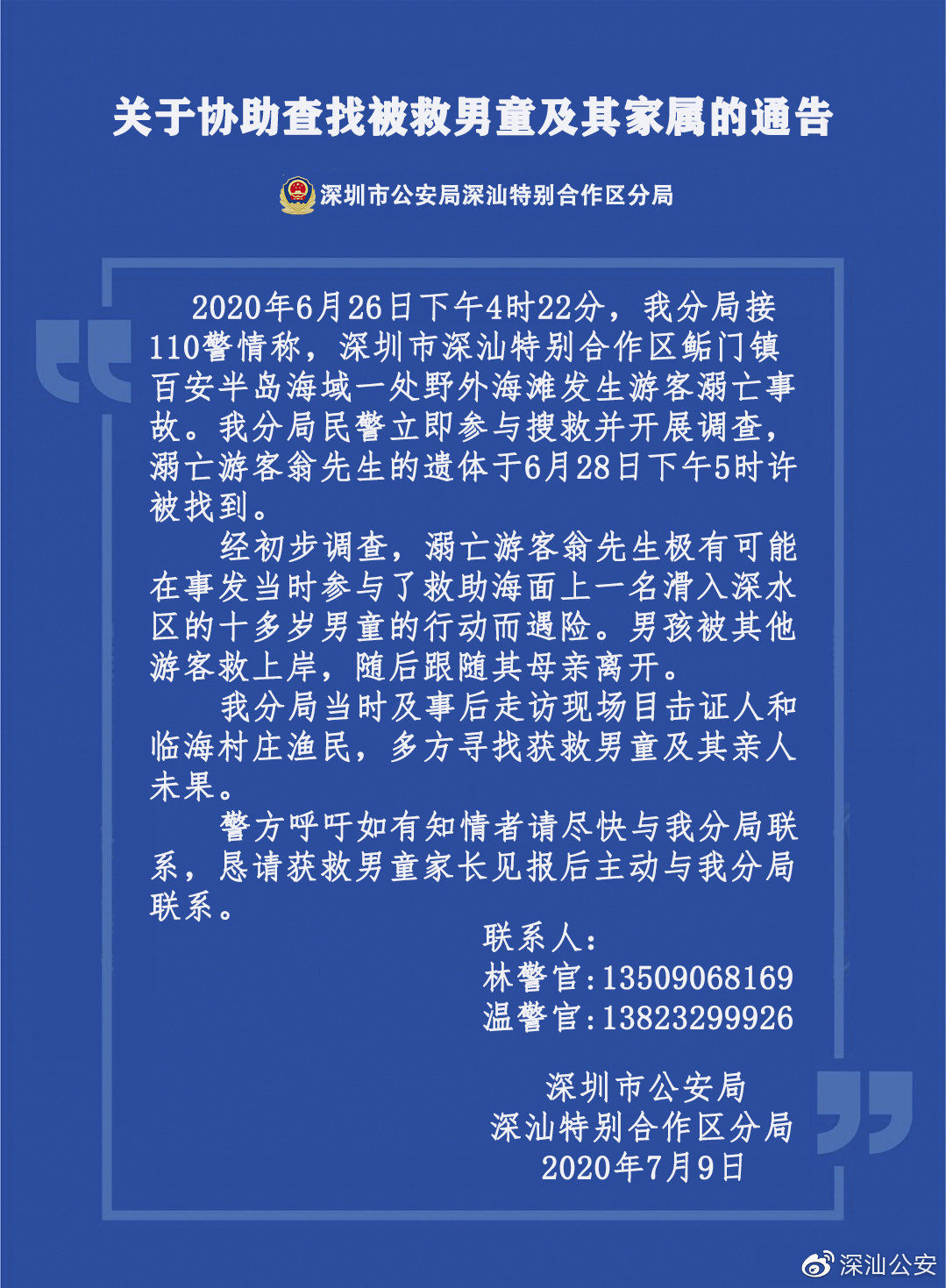 荔枝新闻讯 7月9日,深汕公安 发布《关于协助查找被救男童及其家属的通告》。据通告称,6月26日下午一处野外海滩发生游客溺亡事故。经初步调查,溺亡游客翁佳浩极有可能在事发当时参与了救助海面上一名滑入深水区的十多岁男童的行动而遇险。男孩被其他游客救上岸,随后跟随其母亲离开。走访现场目击证人和临海村庄渔民,多方寻找获救男童及其亲人未果。警方呼吁如有知情者请尽快与该局联系,恳请获救男童家长见报后主动与该局联系。