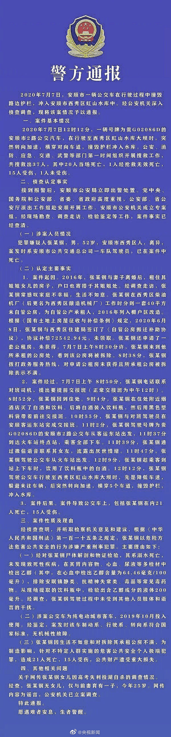 2020年7月7日中午12时许,安顺市一辆公交车在行驶过程中撞坏湖边护栏,坠入安顺市西秀区虹山水库中。事件发生后,公安部、应急管理部等国家有关部门及省、市迅速组成调查组开展缜密调查,现将有关情况通报如下: