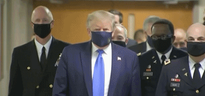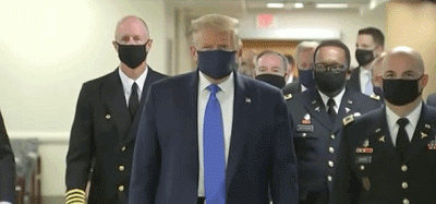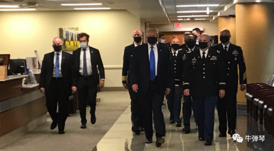 7月11日,一群口罩男出现在了华盛顿郊外的沃尔特·里德军事医院,特朗普领衔出场,他的黑色口罩上,还打着总统印章,应该是特制款。
