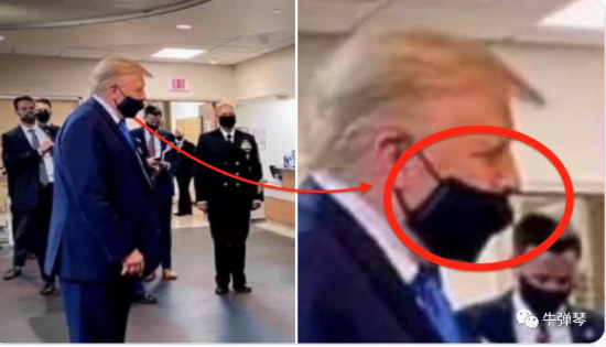 可能是特朗普觉得憋气,或者说觉得憋屈,于是干脆把鼻子露在了口罩外。