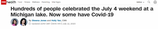 美国有线电视新闻网(CNN)12日消息称,7月4日美国独立日当天,密歇根州有数百名狂欢者在当地一个湖边举行了庆祝活动。但之后,部分人新冠病毒检测结果呈阳性。当地卫生官员警告说,其他参加聚会的人可能也被感染。