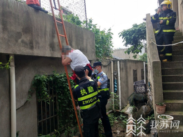 7月12日早上6点多,南京市公安局江北新区分局特巡警支队十村警务站接到报警,江北某民房有位老人被困在房顶屋檐边下不来,希望民警到现场救助。