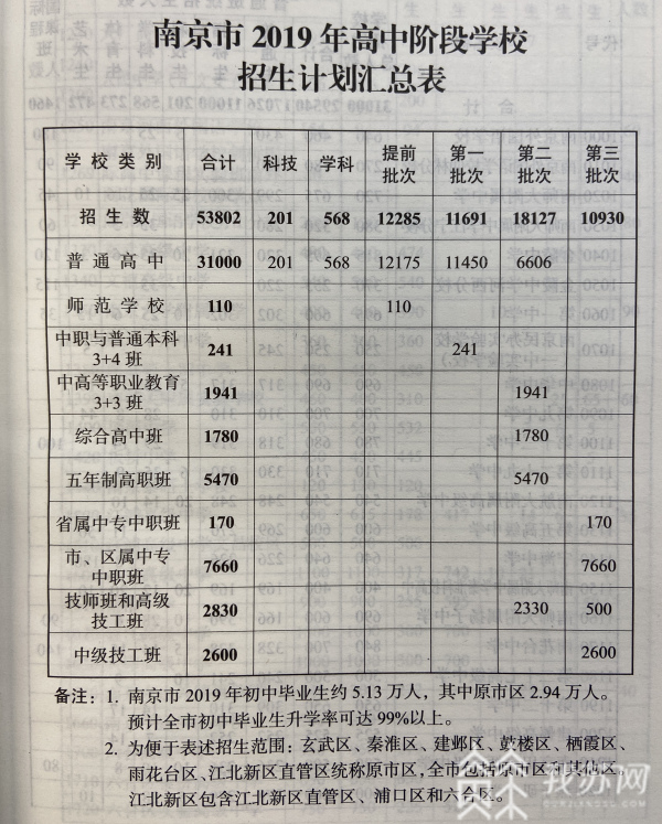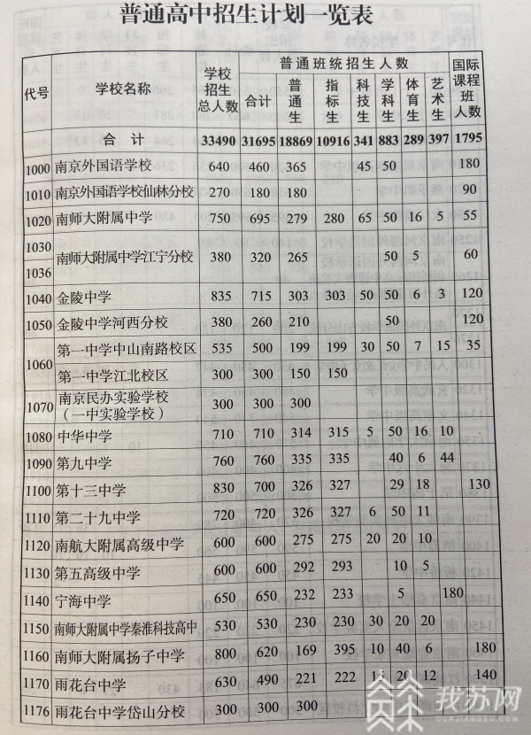 2020年南京普通高中招生计划33629人,其中普通生18869人,指标生10916人,科技生341人,学科生883人,体育生289人,艺术生397人,国际班1795人,另有空军青少年航空学校计划40人,双拥共建生计划99人。根据普高招生数与初中毕业生数计算,今年南京普高录取率预计将超过60%。