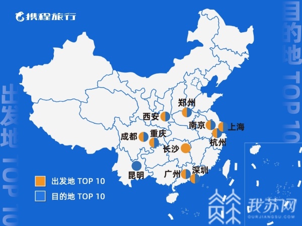 综合截至7月10日的预订数据,上海、广州、成都、深圳、重庆、杭州、西安、南京、郑州、长沙为排名前十的出发地。