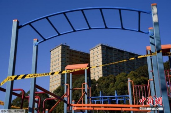 资料图:当地时间7月8日,澳大利亚墨尔本,一座公共住宅楼前的操场被警戒带封锁。