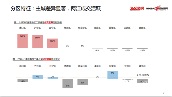 另一方面,上半年在365二手房频道新增挂牌量约4.2万套,同比上涨8%。与去年同期相比是稳步回升。其中,江宁、鼓楼和浦口仍是挂牌大户,占比超过40%,六合区上半年挂牌量超过5000套,同比去年同期,增幅超过120%。而鼓楼和建邺区,因新一轮学区房利好刺激,挂牌价格涨幅明显超8%,其次玄武、秦淮和栖霞挂牌价涨幅约5%。