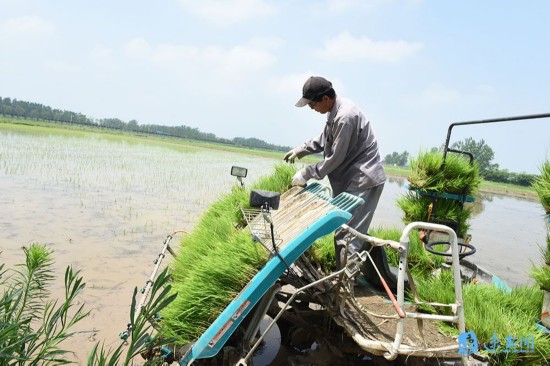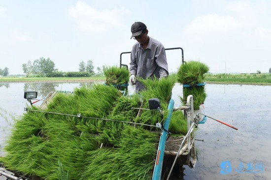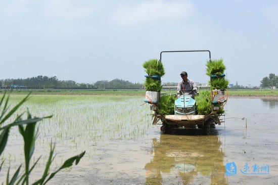 7月10日上午,在宿迁市宿豫区大兴镇双茶棚社区一块300亩的连片水田里,种粮大户袁立学开着插秧机在插秧苗。插秧机所过之处,一排排整齐的水稻秧苗就插好了。