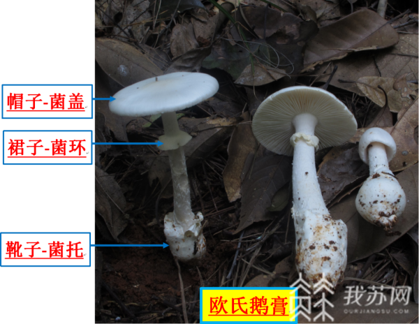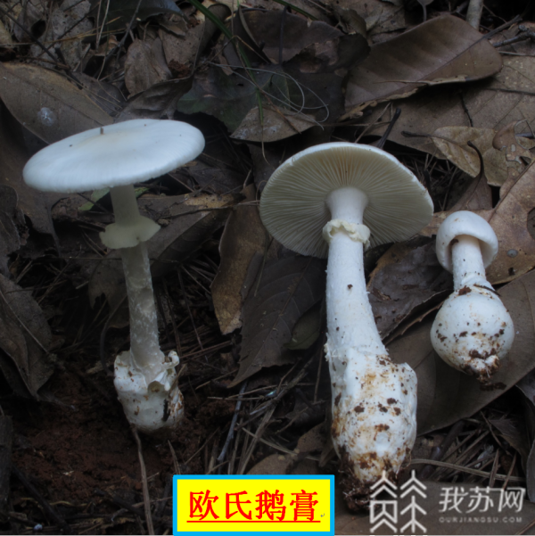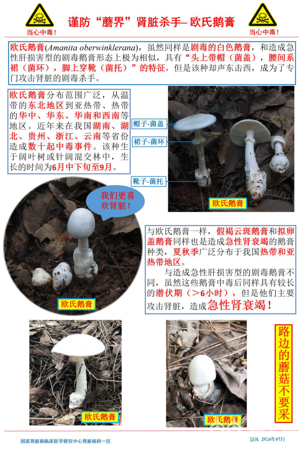 据许书添副主任医师介绍,欧氏鹅膏(Amantita oberwinklerana),虽然同样是剧毒的白色鹅膏,和造成急性肝害型的剧毒鹅膏形态上极为相似,具有“头上戴帽(菌盖),腰间系裙(菌环),脚上穿靴(菌托)”的特征,但是该种却声东击西,成为了专门攻击肾脏的剧毒杀手。