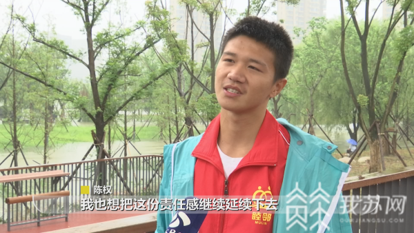 今年18岁的陈权是一名高三毕业生,家住南京江宁区下墟社区。高考结束那天,在回家路上他看见了防汛值守的社区志愿者,心里一阵感动。陈权说:“看到很多防汛志愿者在河堤周围清理垃圾,他们挺辛苦的。我觉得自己一个十几岁,这么年轻有活力的小伙子,可以帮上一点点忙。”