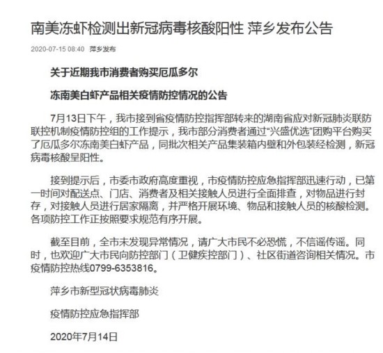 荔枝新闻讯 据萍乡发布微信公众号消息,7月13日下午,我市接到省疫情防控指挥部转来的湖南省应对新冠肺炎联防联控机制疫情防控组的工作提示,我市部分消费者通过“兴盛优选”团购平台购买了厄瓜多尔冻南美白虾产品,同批次相关产品集装箱内壁和外包装经检测,新冠病毒核酸呈阳性。