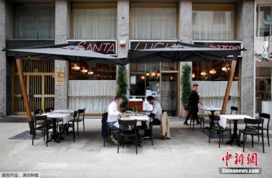资料图:当地时间5月18日,意大利米兰,顾客坐在餐厅的露台上就餐。