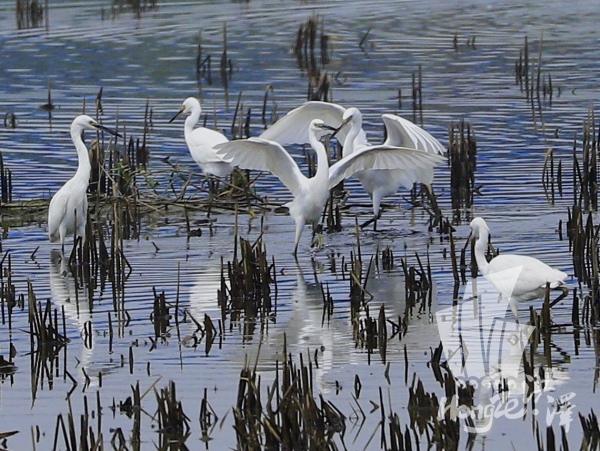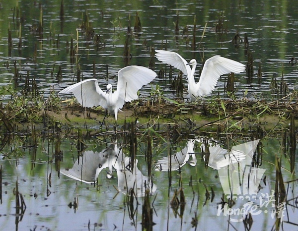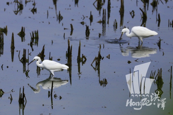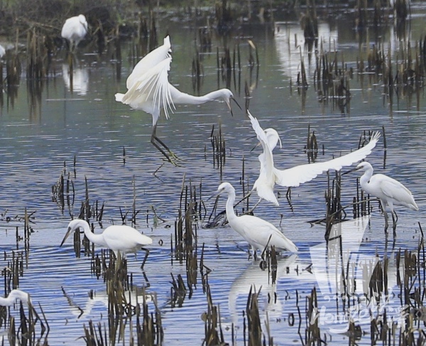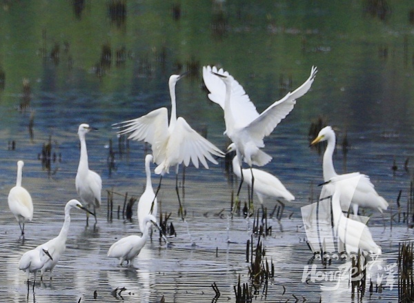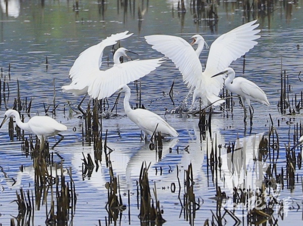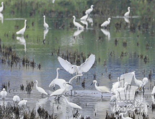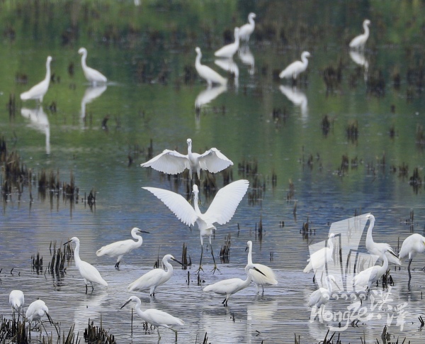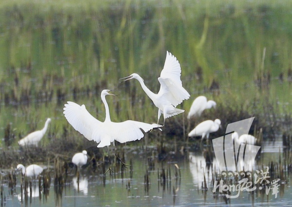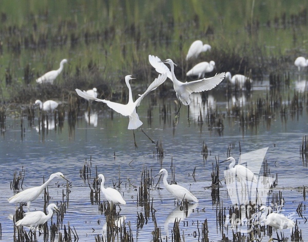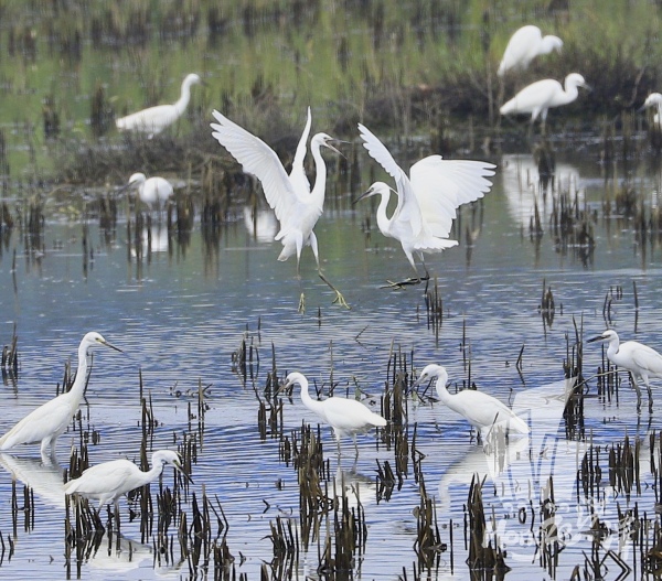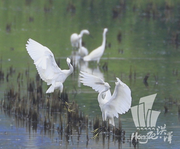 7月14日,洪泽区西顺河镇元明粉厂边上的池塘里,数百只白鹭在觅食、嬉戏、斗殴。